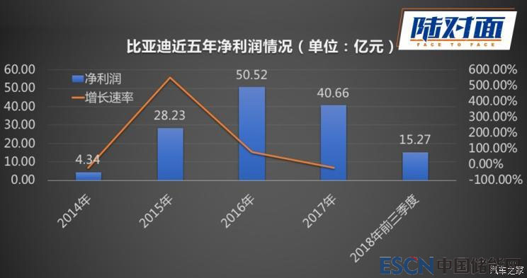 而由于新能源車補貼進一步下降等因素,據(jù)業(yè)績預報,2018年比亞迪全年凈利潤約為27.27億元至31.27億元,比起2017年的40.7億元仍然呈下跌趨勢。當補貼“水分”被擠壓的窘境來臨,也便到了真正拼產(chǎn)品、拼服務的時候。 營收不斷增長,但利潤卻沒有跟上。2015、2016年是比亞迪凈利潤增幅最大的兩年。隨后,營收的增長并沒有帶來凈利潤的提高。相比2016年,比亞迪2017年的凈利潤下降了近2成。對此,王傳福坦言這是受到新能源補貼政策變化及市場競爭影響。