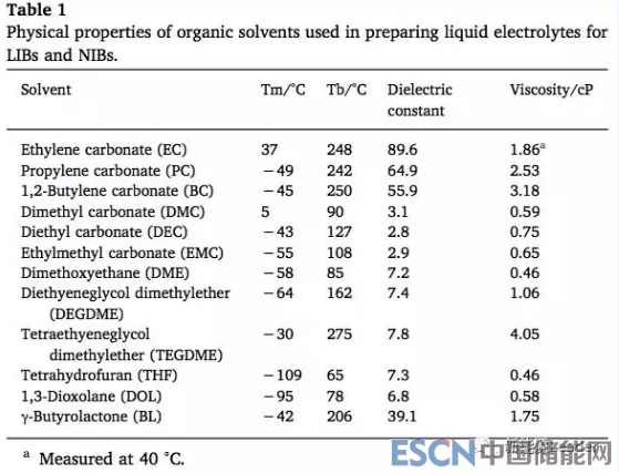 下表為常見的有機溶劑的物性參數(shù),從表中我們能夠注意到環(huán)狀溶劑,例如EC和PC具有較高的介電常數(shù),但是粘度也比較大,而線狀溶劑,例如DMC和DEC等介電常數(shù)比較低,但是粘度比較低,因此為了同時滿足較高的介電常數(shù)和較低的粘度的要求,在鋰離子電池中環(huán)形溶劑和線形溶劑通常會混合使用,Ponrouch等人的研究則進一步顯示將碳酸脂類溶劑與醚類溶劑混合使用能夠獲得更好的電導率和更好的循環(huán)性能,因此通常Na離子電池的電解液也需要多種溶劑混合使用。