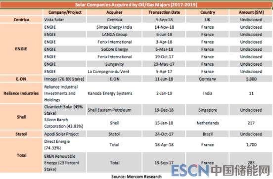 Mercom表示,石油行業(yè)對太陽能行業(yè)最大單筆投資是來自德國意昂集團在2018年6月斥資58億美元收購可再生能源公司Innogy的76.8%股份。其次是法國道達爾公司,以7億美元投資Direct Energie,持股74.3%。
