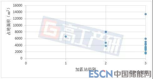 分析三級(jí)加氫站的占地面積分布,14座加氫站中,3座加氫站占地面積為1500-2000(含)m2,2000(不含)-3000(含)m2的加氫站有3座,3座占地面積為3000(不含)-4000(含)m2的加氫站;占地面積>5000m2的加氫站有3座,面積分布較廣。
