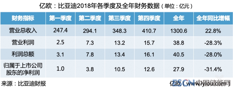 2月26日晚間,比亞迪發(fā)布2018年度財報。財報信息顯示,公司營業(yè)總收入達1300.55億元,同比增長22.79%;歸屬于上市公司股東凈利潤達27.91億元,同比下滑31.4%。盈利表現(xiàn)基本符合此前比亞迪在第三季度報告中提到的2018年凈利潤同比下滑23.10%~32.94%的預測。