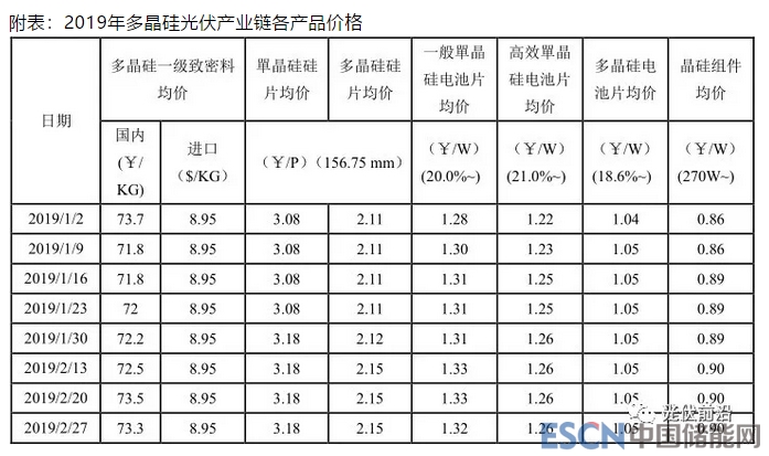 從各企業(yè)生產(chǎn)情況看,1-2月份檢修企業(yè)包括新特能源(小型局部維護(hù))、四川永祥(小型局部維護(hù))、鄂爾多斯、天宏硅業(yè)、內(nèi)蒙東立,截止2月底,除天宏硅業(yè)和內(nèi)蒙東立外均恢復(fù)正常生產(chǎn)。保利協(xié)鑫旗下江蘇中能硅業(yè)改良西門子法多晶硅產(chǎn)能維持6萬噸/年產(chǎn)能正常運(yùn)行;硅烷流化床法5000噸/年顆粒硅項(xiàng)目運(yùn)行逐步完善,月產(chǎn)量在400噸左右;新疆協(xié)鑫6萬噸/年多晶硅月產(chǎn)量逐步提升,達(dá)產(chǎn)率已經(jīng)達(dá)到50%以上。通威股份旗下四川永祥1月份進(jìn)行小型維護(hù),產(chǎn)量影響300噸左右,2月初恢復(fù)正常生產(chǎn);內(nèi)蒙古通威2.5萬噸產(chǎn)能于2018年10月底投產(chǎn)運(yùn)行,從11月份開始逐步釋放產(chǎn)量,月產(chǎn)量逐漸增加,截止2月底已基本達(dá)到滿產(chǎn)運(yùn)行;永祥新能源也成功于12月底投產(chǎn)運(yùn)行,2月份有少量產(chǎn)出。新特能源1月份小型維護(hù),產(chǎn)量幾乎不受影響,新建3.6萬噸/年產(chǎn)能預(yù)計3月份量產(chǎn)。新疆大全新增1萬噸/年擴(kuò)產(chǎn)項(xiàng)目于2018年10月底投產(chǎn)運(yùn)行,到年底前已基本達(dá)產(chǎn),另外5000噸/年去瓶頸化項(xiàng)目也于2019年1月份完成,截止2月份產(chǎn)能達(dá)到3.5萬噸/年。東方希望一期二線1.5萬噸/年產(chǎn)能逐步釋放,一期3萬噸/年產(chǎn)能達(dá)產(chǎn)率約80%。