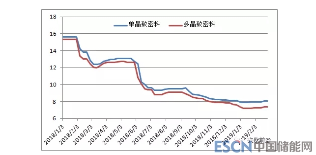 2019年1-2月份國內(nèi)多晶硅價格軟性回彈,單晶致密料價格從1月初的7.96萬元/噸小幅回升至2月底的8.03萬元/噸,漲幅僅有0.9%。多晶致密料價格1月第一周延續(xù)2018年4季度下滑走勢從7.37萬元/噸探底至7.18萬元/噸,隨后小幅反彈至2月底的7.33萬元/噸,比1月初尚有0.5%的跌幅,且月末已現(xiàn)跌勢。2月份單晶致密料均價為7.99萬元/噸,同比大幅下滑41.6%,2月份多晶致密料均價7.31萬元/噸,同比大幅下滑43.6%。