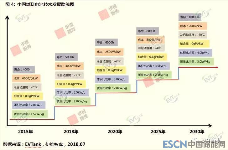在技術(shù)發(fā)展路線圖方面,EVTank基于對(duì)行業(yè)技術(shù)專家的訪談和公開(kāi)資料的整理,認(rèn)為中國(guó)的燃料電池目前在各種技術(shù)指標(biāo)方面均與國(guó)外存在明顯的差距,但是隨著中國(guó)燃料電池應(yīng)用市場(chǎng)的逐步成熟,有望帶動(dòng)燃料電池產(chǎn)業(yè)規(guī)模的快速擴(kuò)大,從而帶動(dòng)燃料電池技術(shù)的進(jìn)步。EVTank認(rèn)為到2025年,中國(guó)燃料電池的技術(shù)性能和成本指標(biāo)有望分別達(dá)到產(chǎn)業(yè)化發(fā)展的初期階段,而到2030年,中國(guó)燃料電池電堆的成本有望降低到200元/Kw,從而開(kāi)始迎來(lái)燃料的大規(guī)模產(chǎn)業(yè)化發(fā)展的階段。