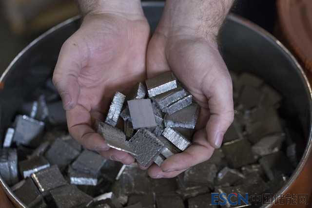 圖:在荷蘭,電池上被切割的陰極材料鈷被放在桶上