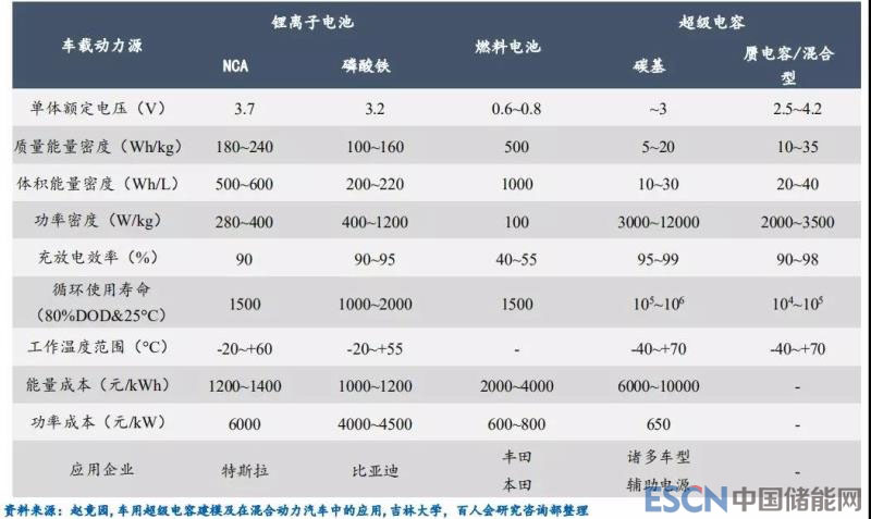 與鋰離子電池和燃料電池相比,超級電容器具有其獨特的技術(shù)性能。目前在新能源汽車領(lǐng)域主要應(yīng)用的鋰電池與燃料電池的功率密度、循環(huán)壽命還較低,單獨作為動力源時不可避免地存在一些局限性,比如純電動汽車高速行駛下耗電量增加等問題。與此相比,超級電容器的功率密度高,并且其循環(huán)壽命、低溫性能優(yōu)越,能較好地適應(yīng)汽車的長期運行工況和特殊氣候使用場景,但作為單獨(或主要)車用動力源時能量密度過低、成本極高,并沒有得到大規(guī)模普及。