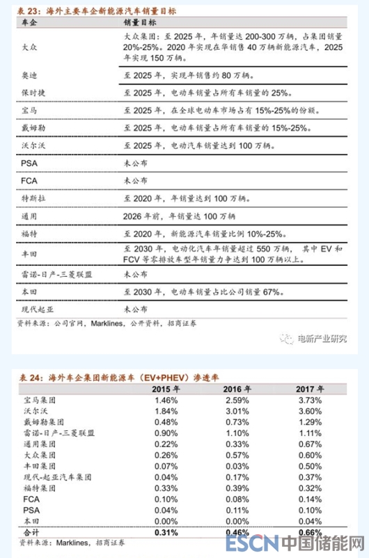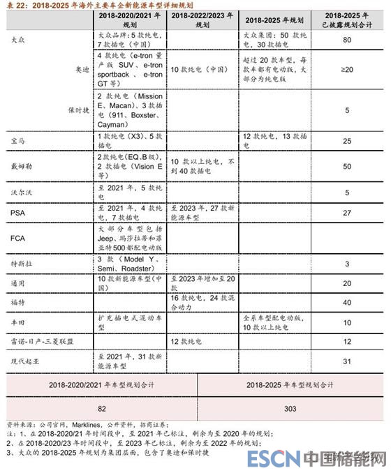 在2018-2025年期間,將推出的新能源車型總數(shù)將大于303款,年均38款以上;而2015-2017年海外13大車企集團年均上市車型為13款。新車型推出數(shù)量快速增長,而其中部分企業(yè)還未提出明確的車型數(shù)量目標。