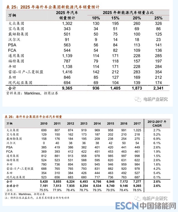 2025年海外車企新能源車當年銷量預計達1400萬輛以上。2012-2017年,海外12大車企集團(不包含特斯拉)所有整車銷量CAGR約2.6%。假設該復合增速為2017-2025年的增速,對應2025年銷量為9365萬輛。我們分別假設2025年12大車企集團新能源汽車(EV+PHEV)滲透率為10%、15%、20%、25%,分別對應936、1405、1873、2341萬輛的當年銷量。中性預測2025年海外12大車企的新能源汽車銷量有望達到1400-1900萬輛。