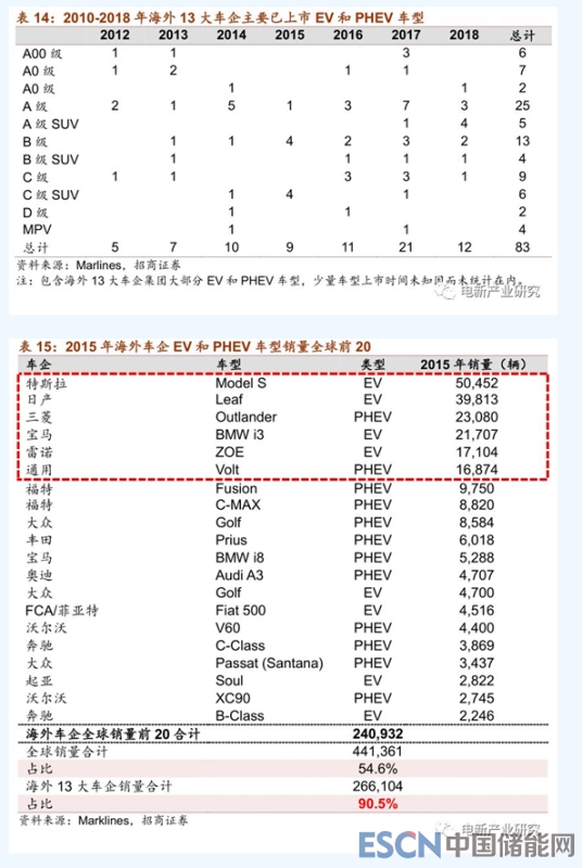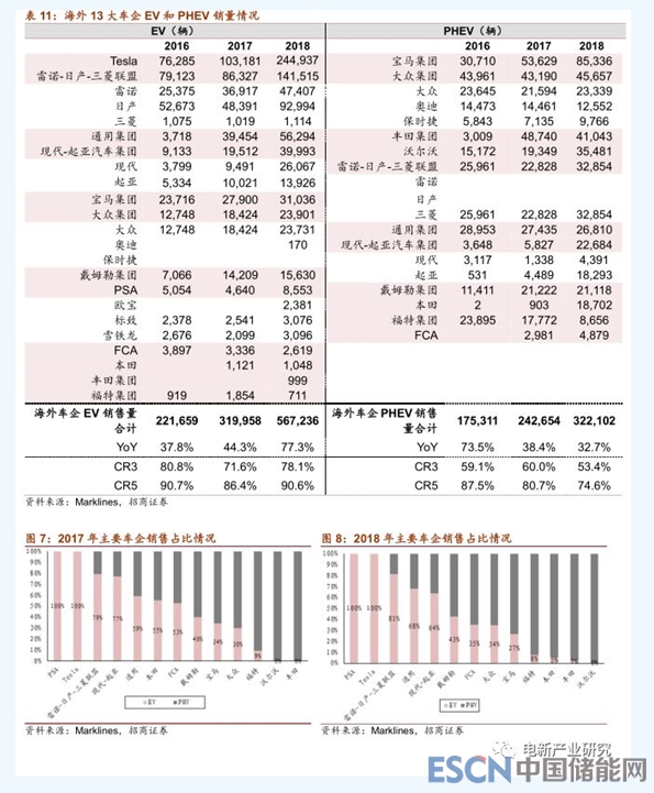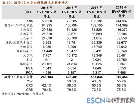 2018年特斯拉、雷諾-日產(chǎn)-三菱聯(lián)盟和寶馬兩家占據(jù)電動車(EV+PHEV)銷量的前兩位,達到10萬臺水平,通用、大眾、現(xiàn)代起亞分列3-6位,銷量在6萬臺以上(通用在8萬臺以上)。2015-2018年行業(yè)格局較為穩(wěn)固,銷量前5名基本沒有變化。