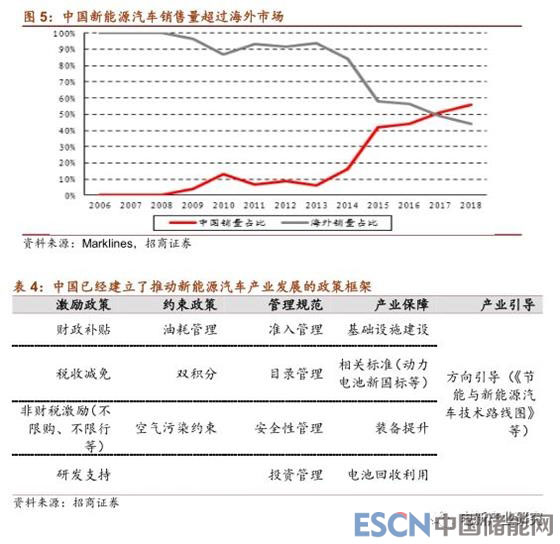 中國市場急劇增長,全球銷量占比達56%。中國市場2018年新能源汽車(EV+PHEV)銷售103.2萬輛,其中純電動和插電混動銷售量分別達到77和26.2萬輛,同比分別增長81.9%、68.6%、136.9%。從全球角度看,在中國政府科學的政策路線推動下,中國新能源汽車銷量的全球占比已達56%,穩(wěn)居龍頭位置。