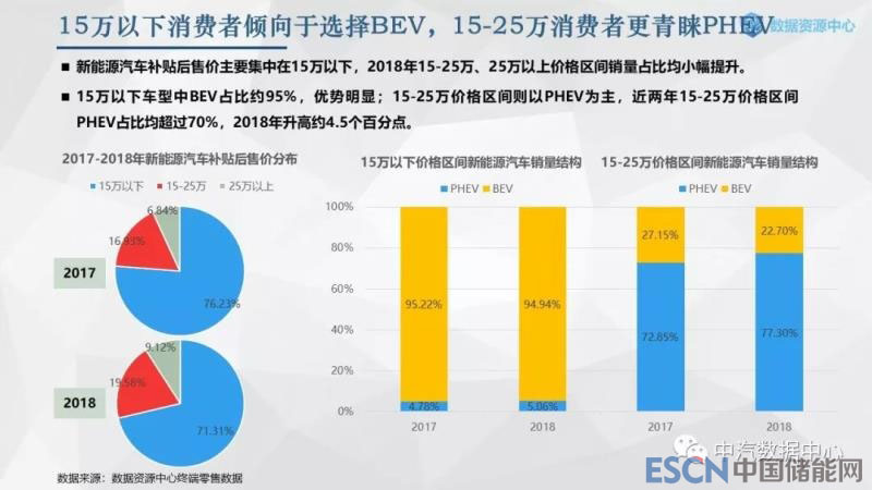 受經(jīng)濟(jì)收入水平、傳統(tǒng)車牌照價格等因素影響,一線限購城市15萬以上新能源車型銷量占比接近45%,其中15-25萬車型份額超過30%,大幅領(lǐng)先其他城市。非限購城市中15萬以下車型為銷售主力,但15萬以上車型占比較上一年有所提升。據(jù)統(tǒng)計,在15-25萬元的售價區(qū)間,70%以上的消費者更傾向于PHEV;而在15萬元以下售價區(qū)間,由于PHEV的可選擇性很小,90%以上的消費者選擇了BEV,這也是一線限購城市能夠驅(qū)動PHEV快速發(fā)展的主要原因。