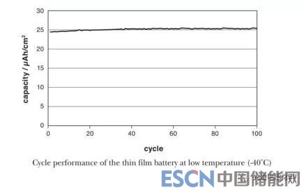 低溫耐受性測(cè)試:從下圖示,電池在低溫-40℃規(guī)定的充放電(The test conditions were a constant current of 0.02 mA, charged to 0.02 mAh, and discharged to 3.0 V)、循環(huán)(試驗(yàn)條件為恒流0.02 mA,充至0.02 mAh,放電至3.0 V)條件下,可以觀察到,容量因低溫影響,也是非常小的,仍然有很穩(wěn)定的放出和充入。
