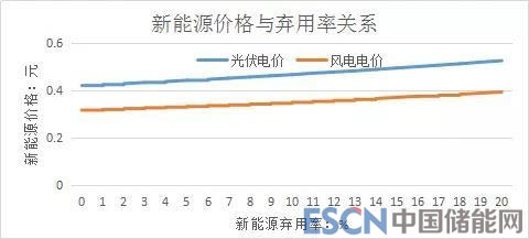 在不考慮棄用條件下風(fēng)電上網(wǎng)電價0.318元/千瓦時,光伏上網(wǎng)電價0.422元/千瓦時,棄用率每增加1%上網(wǎng)電價增加1%,光電上網(wǎng)價格比火電上網(wǎng)價格高0.2元/千瓦時,風(fēng)電上網(wǎng)價格比火電上網(wǎng)價格高0.1元/千瓦時。