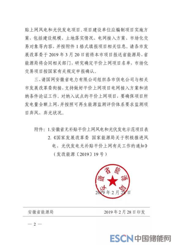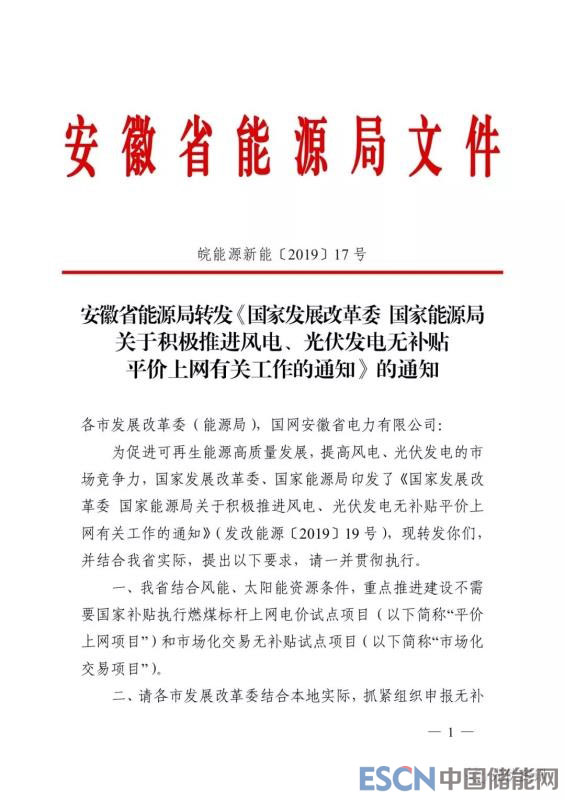 中國儲能網(wǎng)訊:安徽能源局印發(fā)皖能源新能〔2019〕17號 《安徽省能源局轉(zhuǎn)發(fā)《國家發(fā)展改革委 國家能源局關(guān)于積極推進風電、光伏發(fā)電無補貼平價上網(wǎng)有關(guān)工作的通知》的通知》,要求各市發(fā)展改革委于 2019 年 3 月 20 日前將本市平價上網(wǎng)項目報送省能源局,省能源局將會同相關(guān)部門,研究確定平價上網(wǎng)項目名單,市場化交易項目按國家有關(guān)規(guī)定申報確認。