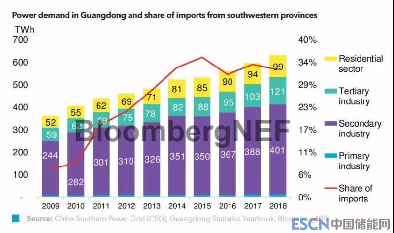 來自云南的水電、貴州的水電和煤電源源不斷地輸入廣東。這部分電量占據(jù)大約全省耗電量的三分之一,解釋了為何全社會用電量大于本地發(fā)電量的差值。西電東送在廣東的調(diào)度中具有優(yōu)先權(quán)。