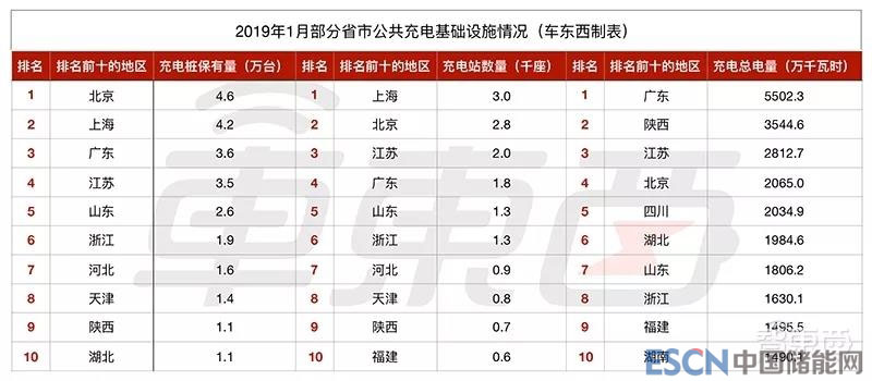 不過在充電總電量上,集中化的趨勢似乎發(fā)生了一些改變,在充電樁保有量以及充電站數(shù)量上均位居第九的陜西以3544.6萬度充電總電量躍升到了第二位,廣東與江蘇則分別以5502.3萬度和2812.7萬度的充電量位居第一、第三,北京2019年1月新能源基礎(chǔ)設(shè)施充電量為2065萬度,排在第四位,而上海則索性從榜單上消失。