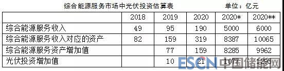 國(guó)家電網(wǎng)公司2018年實(shí)現(xiàn)綜合能源服務(wù)業(yè)務(wù)收入49億元,計(jì)劃2019年、2020年綜合能源服務(wù)業(yè)務(wù)收入分別實(shí)現(xiàn)95億元、190億元。根據(jù)營(yíng)業(yè)收入與資產(chǎn)之比,倒推綜合能源服務(wù)業(yè)務(wù)的資產(chǎn),而后計(jì)算出每年綜合能源服務(wù)業(yè)務(wù)資產(chǎn)增加值,最后以光伏投資占綜合能源服務(wù)總投資的比重估算出光伏投資。2019年、2020年,國(guó)家電網(wǎng)公司在綜合能源服務(wù)業(yè)務(wù)中的光伏投資將分別達(dá)到10億元、21億元。