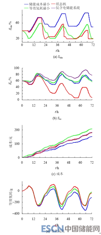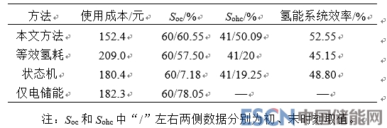 雖然目前尚沒有對微電網(wǎng)能量管理方法進(jìn)行統(tǒng)一評估及比較的標(biāo)準(zhǔn),但仍可以引入一些指標(biāo)來顯示各個(gè)控制策略的優(yōu)缺點(diǎn),幫助對該能量管理方式進(jìn)行進(jìn)一步評價(jià)?;诿總€(gè)運(yùn)行周期得出結(jié)果的對比,可以體現(xiàn)出能量管理系統(tǒng)的性能。本文采用使用成本、Soc、Sohc和氫儲能系統(tǒng)平均效率4個(gè)指標(biāo),對本文所提出的能量管理方法、等效氫耗方法、狀態(tài)機(jī)方法在相同參數(shù)和工況下進(jìn)行比較;而在僅含有電儲能系統(tǒng)的微電網(wǎng)中,蓄電池的容量調(diào)整為1200 Ah以確保儲能系統(tǒng)的容量滿足系統(tǒng)運(yùn)行的要求,所得結(jié)果如圖9所示。具體指標(biāo)對比結(jié)果如表3所示。