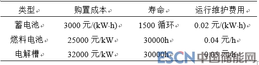 本文采用的蓄電池、燃料電池及電解槽的購置成本[32]如表1所示。