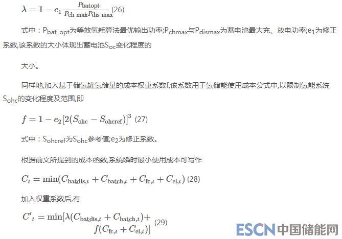 修正系數(shù)e1、e2的大小決定了權(quán)重系數(shù)λ與f變化的快慢,即蓄電池Soc及氫儲能系統(tǒng)Sohc回歸參考值速度的快慢,系數(shù)越大,Soc或Sohc回到參考值的速度越快。因此加入權(quán)重后,儲能系統(tǒng)使用成本根據(jù)儲能情況存在一定波動,進(jìn)而對各微源的功率輸出進(jìn)行一定的修正。