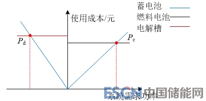 由式(22)可知,蓄電池使用成本與其輸出功率線性相關(guān),而氫儲能系統(tǒng)使用成本在額定功率范圍內(nèi)不變化,則瞬時(shí)狀態(tài)下蓄電池與氫能系統(tǒng)使用成本與功率關(guān)系可如圖4所示。