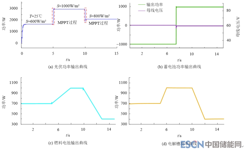 同時(shí),為了防止電解槽及燃料電池功率變化過大從而影響其工作性能,在底層對功率的變化速率進(jìn)行了限制。如圖3(c)—(d)所示,為燃料電池、電解槽的功率曲線。變流器根據(jù)如圖2所示的電流環(huán)進(jìn)行控制,使其輸出/輸入功率由700 W增加至1000W再減小至400 W,根據(jù)兩者的功率曲線可知,燃料電池及電解槽能夠根據(jù)給出的參考功率進(jìn)行工作,且均存在一定的響應(yīng)時(shí)間。
