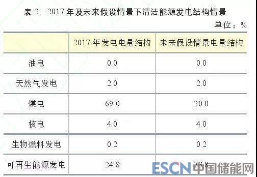 當(dāng)前我國電源結(jié)構(gòu)仍以化石能源發(fā)電為主,2017年煤電發(fā)電量占總發(fā)電量的69%。作為對比,本文假設(shè)未來清潔能源發(fā)電結(jié)構(gòu)下煤電電量占比下降至20%,可再生能源發(fā)電占比提高到73.8%,見表 2。