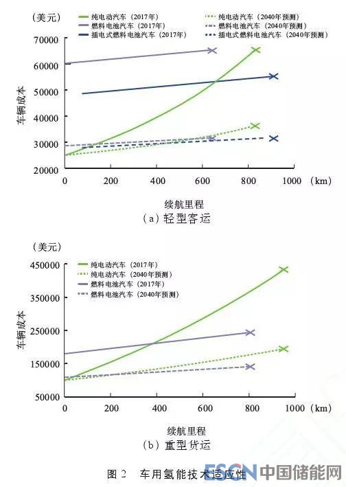 雖然目前氫能以工業(yè)原料消費為主,但未來交通部門應(yīng)用潛力巨大。燃料電池功率和儲能單元彼此獨立,增加能量單元對車輛成本和車重影響相對較小,氫燃料電池在重型交通領(lǐng)域相比鋰電池具有更強(qiáng)的技術(shù)適應(yīng)性。圖 2 為氫燃料電池汽車和純電動汽車在輕型客車(圖 2a)和重型貨車(圖 2b)應(yīng)用中的成本對比,可見隨著車重和續(xù)航的提升,燃料電池汽車成本將逐步接近甚至低于純電動汽車。