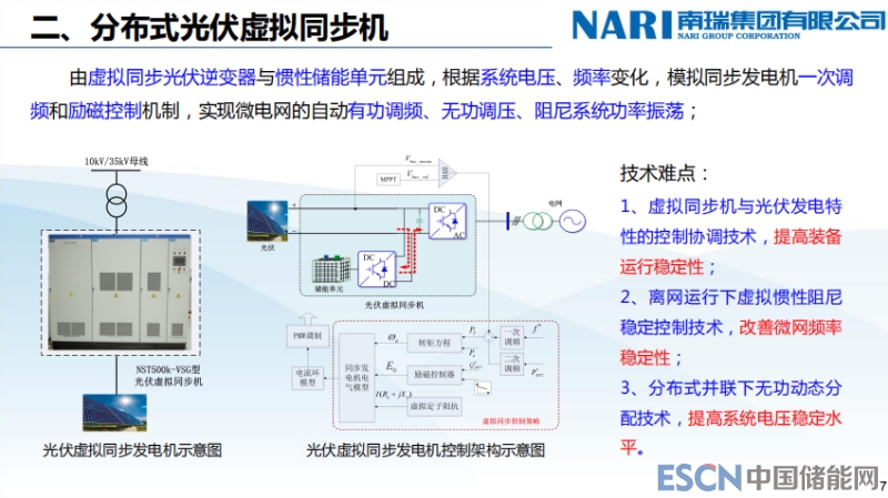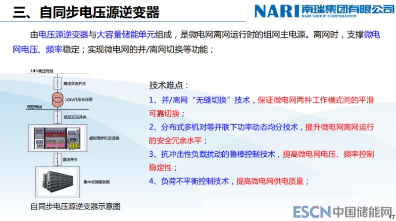 下面講自同步電壓源逆變器,剛才用光伏逆變器,這個主要用在儲能上面,由電壓源逆變器與大容量儲能單元組成,是微電網(wǎng)離網(wǎng)運行時的組網(wǎng)主電源。離網(wǎng)時支撐微電網(wǎng)電壓、頻率穩(wěn)定;實現(xiàn)微電網(wǎng)的并離網(wǎng)切換等功能。下面幾個難題我們會分別介紹一下,就是說它實現(xiàn)了這些功能。