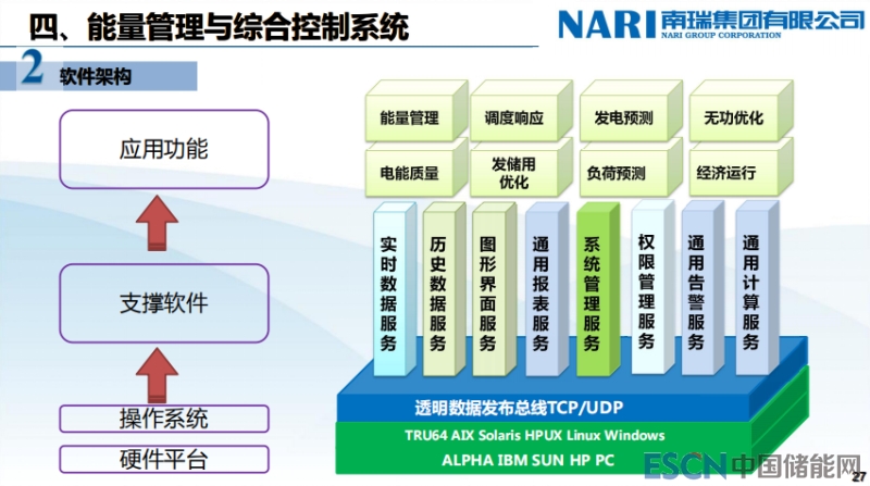 從功能上來說,底下是硬件平臺,中間是操作系統(tǒng),然后是操作系統(tǒng)上的支撐應(yīng)用軟件,后臺是高級應(yīng)用。這里面是高級應(yīng)用的主要功能,第一是發(fā)電和用電的預(yù)測;第二是黑啟動控制;第三實現(xiàn)了并離網(wǎng)的切換。同步電壓源在實現(xiàn)并離網(wǎng)切換過程中,能夠?qū)崿F(xiàn)頻率穩(wěn)定平滑的自動控制功能。下面離網(wǎng)的能量調(diào)動和自動電壓的控制,以及調(diào)度交換功率控制,分布電源平滑出力控制,調(diào)度交換功率緊急控制,還有配網(wǎng)聯(lián)合調(diào)度。