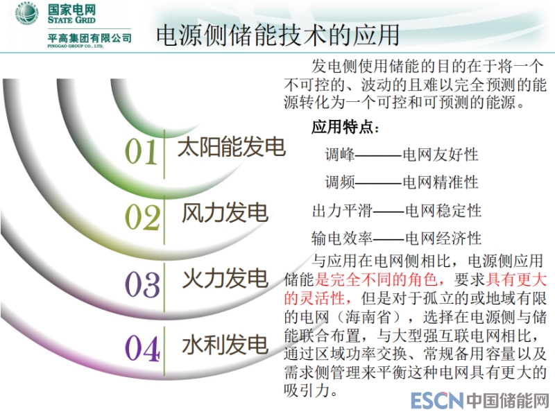 電源側(cè)儲(chǔ)能技術(shù)的應(yīng)用,電源側(cè)從國(guó)內(nèi)區(qū)域分西北、東北地區(qū)是太陽能風(fēng)力發(fā)電,華中地區(qū)最多是火力發(fā)電,華東更多是水利發(fā)電。電源側(cè)應(yīng)用儲(chǔ)能的目的,在于不可控的、波動(dòng)的且難以完全預(yù)測(cè)的能源轉(zhuǎn)化為一個(gè)可控和可預(yù)測(cè)的能源。調(diào)峰-電網(wǎng)友好性,調(diào)頻-電網(wǎng)精準(zhǔn)性,出力平滑-電網(wǎng)穩(wěn)定性,輸電效率-電網(wǎng)經(jīng)濟(jì)性。與應(yīng)用在電網(wǎng)側(cè)相比,電源側(cè)應(yīng)用儲(chǔ)能是完全不同的角色,要求具有更大的靈活性,但是對(duì)于孤立的或者區(qū)域有限的電網(wǎng),海南省這些都是獨(dú)立電網(wǎng),選擇在電源側(cè)與儲(chǔ)能聯(lián)合布置,與大型強(qiáng)互聯(lián)電網(wǎng)相比,通過區(qū)域功率交換、常規(guī)備用容量以及需求側(cè)管理來平衡這種電網(wǎng)具有更大的吸引力。