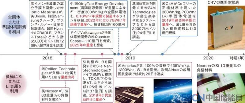 為了(1)中提到的面向EV的全固態(tài)電池,來自全世界的千百億日元規(guī)模的資金集中到某些海外風(fēng)險公司(大部分在美國)。最近中國企業(yè)也有參與,例如中國的隔膜制造商清陶能源,宣布將新建一條全固態(tài)生產(chǎn)線,在2018年末達到0.1Gwh,并且在2020年達到0.7GWh。目前,待批量生產(chǎn)的電池的重量能量密度最初為300Wh / kg。然而目前已經(jīng)在實驗室實現(xiàn)了400Wh/kg,并且將逐漸在量產(chǎn)中實現(xiàn)這一目標(biāo)。