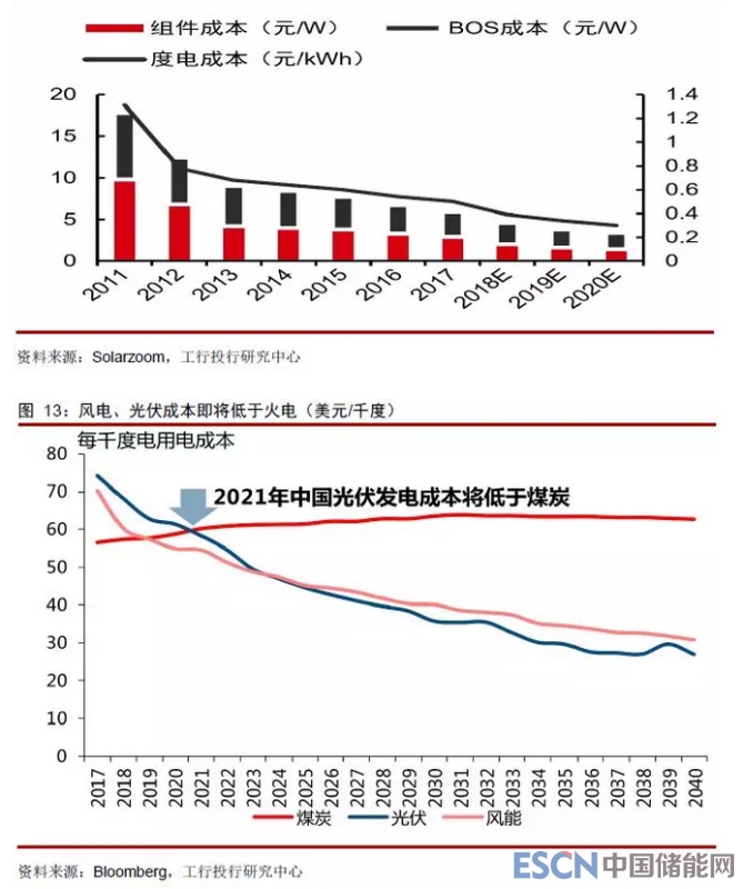 光伏發(fā)電成本不斷降低,未來將成為主導(dǎo)能源之一。當(dāng)下光伏發(fā)電量僅占全球總發(fā)電量1%,發(fā)電成本高是主要掣肘。目前光伏用電成本較煤炭約高31%,但隨著各國光伏市場化進程加快,光伏發(fā)電成本有望在2020年低于煤炭。從光伏產(chǎn)業(yè)鏈的價格來看,光伏級多晶硅的價格由2011年時的54美元/千克降至當(dāng)前平均9美元/千克,而組件的價格則由1.24美元/瓦降至0.22美元/瓦。光伏系統(tǒng)達到降低拉動了光伏發(fā)電成本的降低。目前光伏組件價格繼續(xù)下跌的空間已經(jīng)不是很大,還需要依靠降低非系統(tǒng)成本來降低總的成本。BNEF 預(yù)計未來十年光伏的發(fā)電占比將逐漸上升至 10%。彭博預(yù)計至2040年光伏和風(fēng)能將占全球發(fā)電總裝機量 37%,占比是目前4倍,成為主導(dǎo)能源之一。