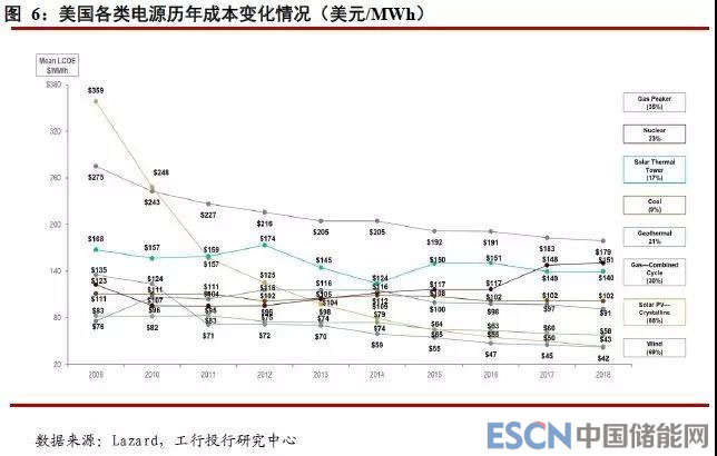 從以上數(shù)據(jù)來看,美國電源結(jié)構(gòu)中,風(fēng)電和光伏的成本已經(jīng)低于火電。其中,陸上風(fēng)電最低已經(jīng)達到0.20元/千瓦時。在光伏系統(tǒng)中,薄膜大型集中電站的最低成本達到了0.25元/千瓦時,比晶硅光伏電站的0.28元/千瓦時還要低。電源結(jié)構(gòu)中,發(fā)電成本最高的是戶用光伏系統(tǒng),最高達到1.86元/千瓦時。