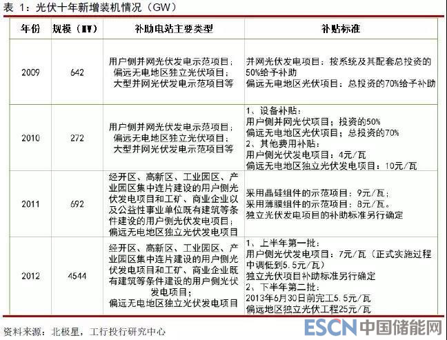 金太陽工程:2009年7月,財政部、科技部、國家能源局聯(lián)合發(fā)布《關(guān)于實施金太陽示范工程的通知》,計劃在2~3年內(nèi),采取財政補助方式支持不低于500MW的光伏發(fā)電示范項目。而具體的補助范圍和金額也在接下來的2009~2012年進行了逐年調(diào)整,見下表: