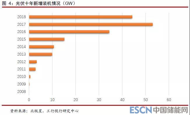 光伏方面:受531新政影響,2018年光伏發(fā)電新增裝機4426萬千瓦,僅次于2017年新增裝機,為歷史第二高。其中,集中式電站和分布式光伏分別新增2330萬千瓦和2096萬千瓦,發(fā)展布局進一步優(yōu)化。到12月底,全國光伏發(fā)電裝機達到1.74億千瓦,其中,集中式電站12384萬千瓦,分布式光伏5061萬千瓦。