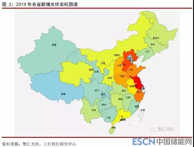從各省的新增裝機情況來看,2018年光伏新增裝機集中在河北、江蘇、山東、浙江等東部區(qū)域。這主要是得益于分布式光伏的發(fā)展。2018年全國集中式電站和分布式光伏分別新增2330萬千瓦和2096萬千瓦,分布式基本上占據(jù)了半壁江山。圖2為各省新增裝機情況如下圖所示。說明,由淺藍→黃→紅,顏色越深代表新增裝機規(guī)模越大。