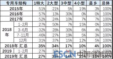 目前看,5.5米-6米的專用車很強(qiáng),19年1-2月的專用車份額達(dá)到76%。而4.5米以下的專用車因?yàn)榈统杀镜膬?yōu)勢(shì)而表現(xiàn)較好,18年回升到12%。