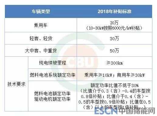 2018年2月,四部委聯(lián)合發(fā)布《關(guān)于調(diào)整完善新能源汽車推廣應(yīng)用財政補貼政策的通知》,要求“燃料電池乘用車依然按燃料電池系統(tǒng)的額定功率進(jìn)行補貼,補貼標(biāo)準(zhǔn)為6000元/kw,上限為20萬元/輛;輕型燃料電池客車、貨車以及大中型客車、中重型貨車依然采用定額補貼方式,補貼上限分別為30萬元/輛和50萬元/輛?!痹撜咭延谕?月12日開始實施。