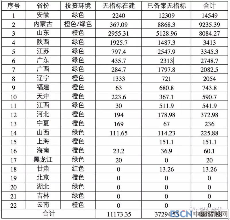 截止目前,已經(jīng)公示的22省的無(wú)指標(biāo)光伏項(xiàng)目合計(jì)為48.5GW。其中在建的為11.2GW,尚未開(kāi)工的有37.3GW??紤]到河南、浙江尚未公示,全國(guó)無(wú)指標(biāo)的項(xiàng)目肯定超過(guò)50GW。
