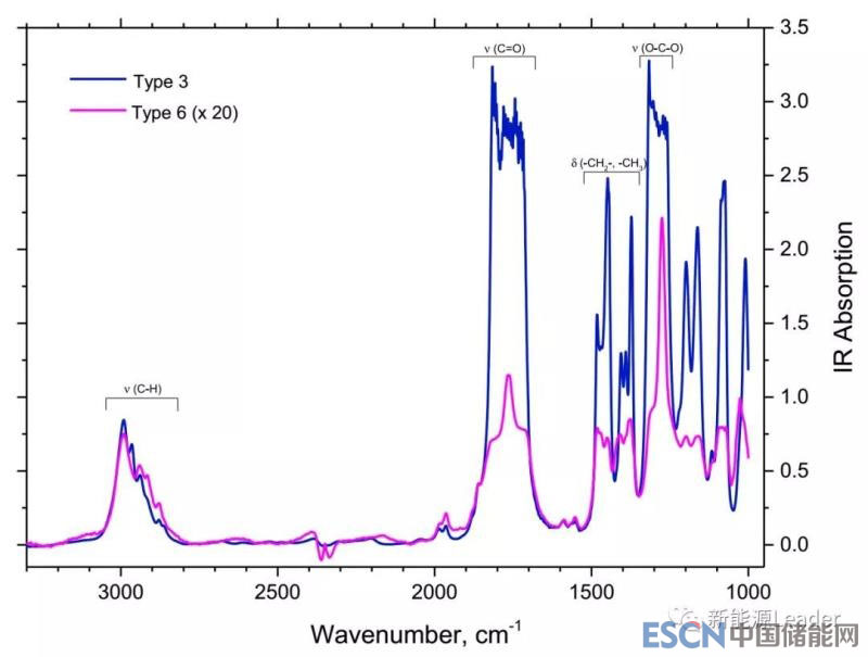 一般而言,電池生產(chǎn)企業(yè)極少對(duì)外透露所用電解液的具體組成。從MSDS提供的少量信息了解到第1組、第2組、第4組和第7組電池所用的溶劑涵蓋DMC、DEC、EMC、EC和EA,均是采用LiPF6作為鋰鹽。為了了解第3組和第6組電池電解液信息,作者進(jìn)行了FITR分析,結(jié)果如圖4所示。從FITR圖譜可大致了解到該兩組電池所用溶劑為也是常規(guī)所使用的DMC、DEC、EMC、EC體系,沒有使用PC和EA。