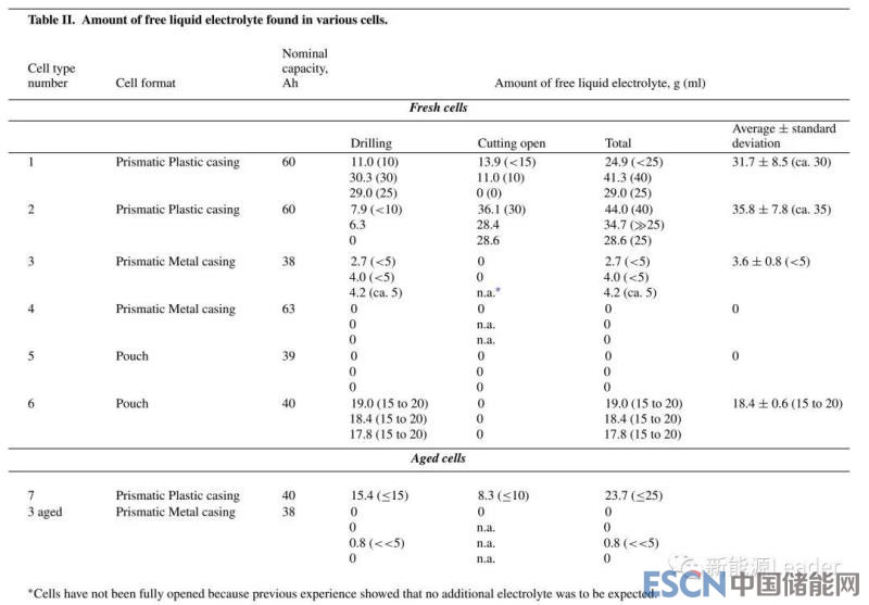 來自歐盟聯(lián)合研究中心的NataliaP. Lebedeva等人的視角相對(duì)特殊,在絕大部分人關(guān)注如何改進(jìn)電解液以提升電池性能的時(shí)候,她們先人一步將注意力集中到了電解液可能帶來的毒性問題。目前常用的電解液中含有多種有毒的溶劑,LiPF6的使用也可能會(huì)產(chǎn)生HF,一旦在密閉空間中電解液泄漏極容易產(chǎn)生高濃度的毒性氛圍對(duì)人造成危害。在本工作中,NataliaP. Lebedeva等研究了商業(yè)化動(dòng)力電池中自由態(tài)電解液量的問題。由于檢測(cè)的電池多來自;整車端且包含部分老化的電池,因此結(jié)果具有較高的參考和實(shí)用價(jià)值。成果以Amountof Free Liquid Electrolyte in Commercial Large Format Prismatic Li-Ion BatteryCells為題發(fā)表在Journalof The Electrochemical Society上。