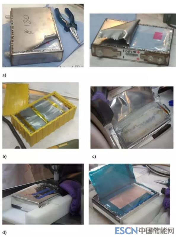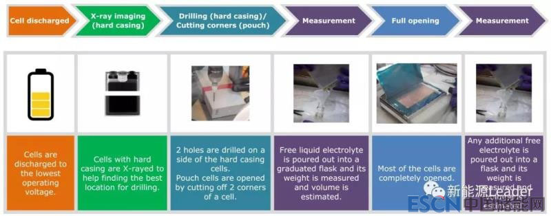 在獲取自由態(tài)電解液之前,作者先對(duì)電池進(jìn)行了CT觀察,以方便確定合適的鉆孔位置。CT確定好鉆孔位置后,先在方形電池和軟包電池表面鉆孔,倒出部分的自由態(tài)電解液。隨后將電池外殼拆解,取出余下的自由態(tài)電解液。