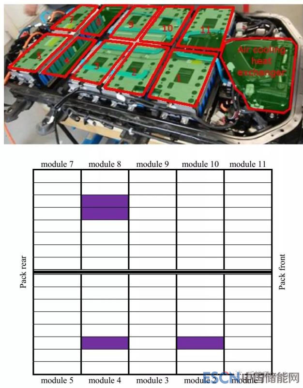 圖2.第3組老化電池所在的電動(dòng)車pack示意圖,紫色所示為所拆解的老化電池在pack中的分布