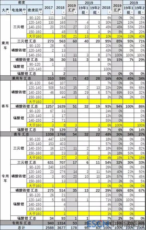 18年客車電池提升很快,錳酸鋰能量度突破160。第二批磷酸鐵鋰的占比保持86%以上,19年第2批磷酸鐵鋰的電池的能量密度達(dá)到120以下為0%.。由于客車的競(jìng)爭(zhēng)相對(duì)充分,大部分客車企業(yè)都能實(shí)現(xiàn)120的補(bǔ)貼鼓勵(lì)要求。客車目前主要貼著補(bǔ)貼推動(dòng),但高于140瓦/千克的新品也是已經(jīng)成為占比100%的新品主流,但低密度的拿補(bǔ)貼少。