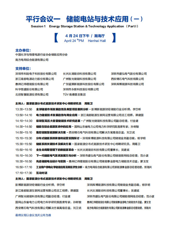 以下是《儲(chǔ)能電站與技術(shù)應(yīng)用專(zhuān)場(chǎng)一》議程內(nèi)容,其他各專(zhuān)場(chǎng)議程組委會(huì)將相繼發(fā)布,敬請(qǐng)關(guān)注!