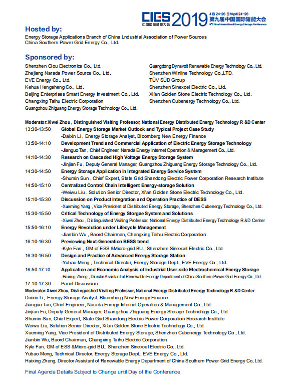 大會(huì)將設(shè)置開(kāi)幕式暨中國(guó)儲(chǔ)能與電力體制改革、國(guó)際儲(chǔ)能與市場(chǎng)、儲(chǔ)能電站與技術(shù)應(yīng)用(四個(gè)專(zhuān)場(chǎng))、儲(chǔ)能成本與投融資、儲(chǔ)能電池與技術(shù)應(yīng)用(兩個(gè)專(zhuān)場(chǎng))、微電網(wǎng)與儲(chǔ)能、氫儲(chǔ)能與燃料電池、能源互聯(lián)網(wǎng)與多能互補(bǔ)、綜合能源服務(wù)、電動(dòng)汽車(chē)與電網(wǎng)互聯(lián)、《2019儲(chǔ)能產(chǎn)業(yè)應(yīng)用研究報(bào)告》發(fā)布等15個(gè)專(zhuān)場(chǎng)論壇。