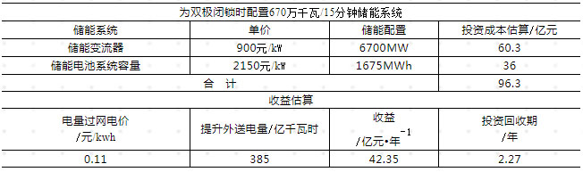 在PSASP仿真平臺中搭建河南電網(wǎng)算例,模擬天中直流在輸送800萬千瓦功率時發(fā)生最惡劣的雙極閉鎖故障時,探索儲能在系統(tǒng)穩(wěn)定過程中的效果及所需儲能容量的大?。煌瑫r,以天中直流輸送通道為載體,分析在受端河南電網(wǎng)布局一定容量的儲能系統(tǒng)作為送端新疆電網(wǎng)的跨區(qū)備用容量源,對新能源發(fā)電占比提升的促進程度。得出投入670萬千瓦/15min儲能系統(tǒng),可提高長南線與天中直流770萬千瓦的穩(wěn)定送功率,提升385億千瓦時的外送電量,設定一年內(nèi)的通道利用小時數(shù)約為5000h,計算結果如表1所示,項目的投資回收期約2.27年。