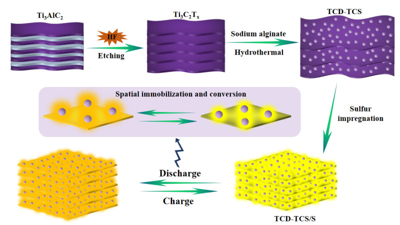 在國家自然科學(xué)基金(21601191,21673241, 21471151))和中國科學(xué)院戰(zhàn)略性先導(dǎo)科技專項(xiàng)(XDB20000000)、福建省自然基金(2018J01030)的資助下,中科院福建物質(zhì)結(jié)構(gòu)研究所結(jié)構(gòu)化學(xué)國家重點(diǎn)實(shí)驗(yàn)室研究員王瑞虎課題組采用海藻酸鈉誘導(dǎo)的化學(xué)鍵裁剪策略,提出基于MXene的Ti3C2Tx(Tx代表表面官能團(tuán))納米點(diǎn)-散布的Ti3C2Tx納米片(TCD-TCS),以實(shí)現(xiàn)在高硫負(fù)載條件下活性物質(zhì)硫的限域固定和轉(zhuǎn)化。TCD-TCS中豐富的表面極性位點(diǎn)增強(qiáng)了電極的結(jié)構(gòu)完整性,不含碳基材料和導(dǎo)電添加劑使得正極材料具有高振實(shí)密度。TCD-TCS/ S電極在1.8mg cm-2的中等載硫量下表現(xiàn)出幾乎理論的放電比容量。在13.8mg cm-2的高硫負(fù)載下,同步實(shí)現(xiàn)超高容量(1957mAh cm-3)和高面積容量(13.7mAh cm-2)。放電過程中硫析出機(jī)理研究表明了基于MXene的納米點(diǎn)和納米片的集成在Li-S電池中的重要性。上述工作發(fā)表于ACS Nano(Ultrafine Ti3C2MXene Nanodots-Interspersed Nanosheet for High-Energy-Density Lithium-Sulfur Batteries,ACS Nano,2019,13,3608–3617)。論文的第一作者為助理研究員肖助兵。