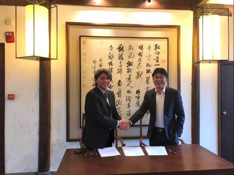 南都電源副總吳賢章(右)與輝能科技創(chuàng)辦人楊思枏(左)簽署協(xié)議